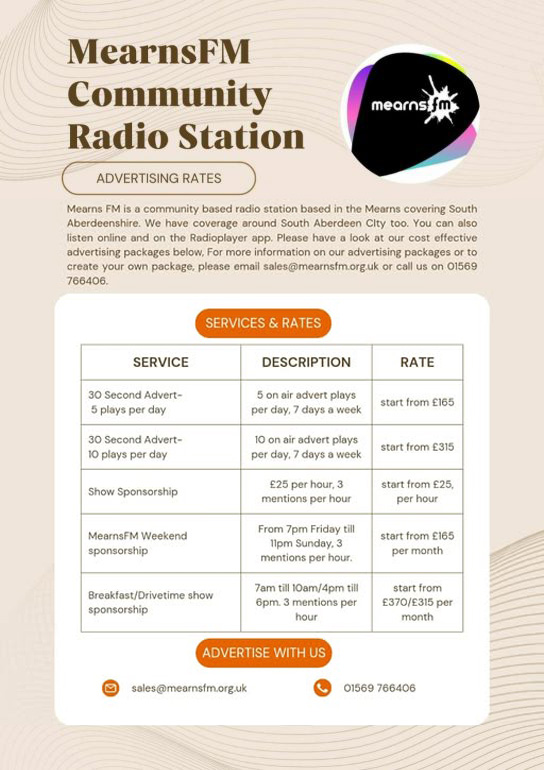If you’d like to explore this further please call us on 01569 766406 choose option 2 or email us on sales@mearnsfm.org.uk. We will work with you to produce either a FREE professional standard radio advert using our talented team of volunteer technicians and voice-over artists or use another production company for a small charge – we then agree an on-air schedule.